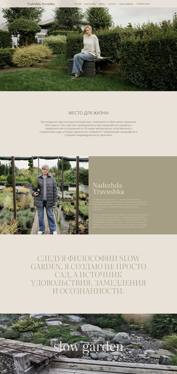 в рамках визуальной концепции нам хотелось отразить стиль работ Надежды, поэтому за основу были выбраны максимально натуральные травянистые оттенки, минималистичный стиль верстки и максимально лаконичный, при этом емкий и профессиональный Tone of voice
