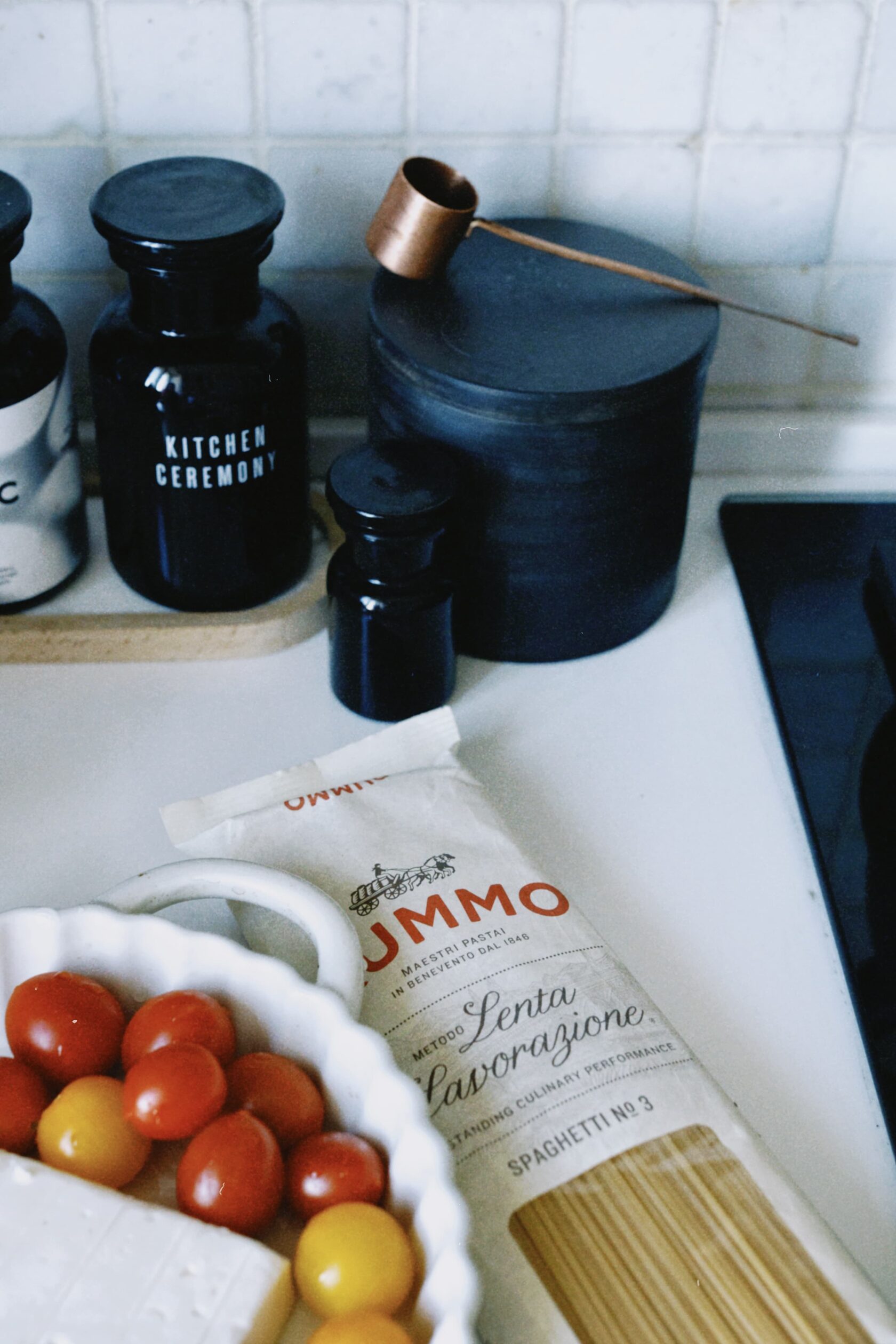 Сладкий перец, черри, красный лук и фету поливаем оливковым маслом и запекаем в духовке 30 минут. Можно добавить сванскую соль.