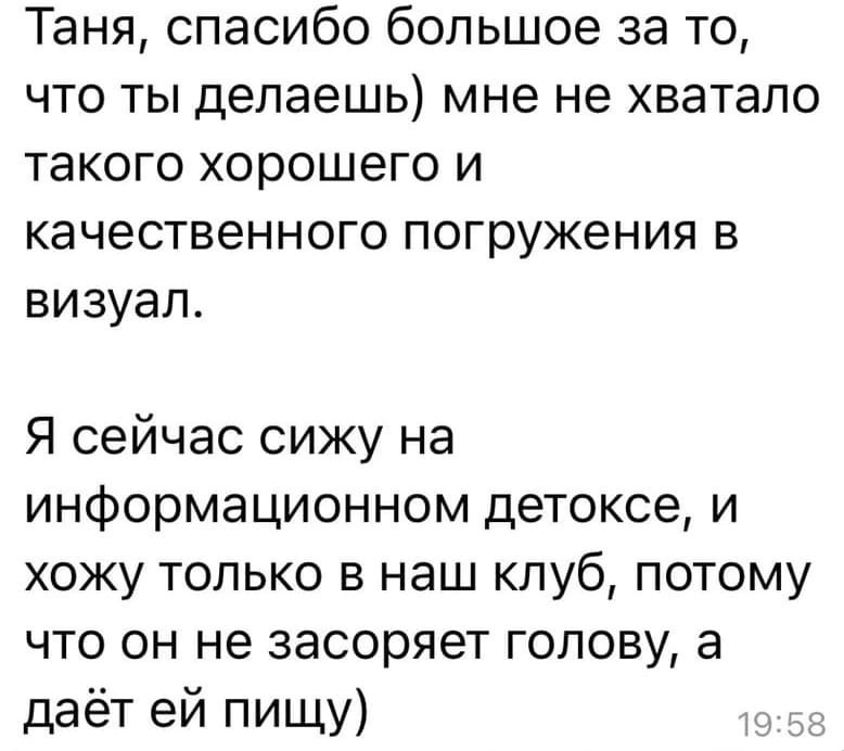 Из этих двух пунктов родился клуб, я подбираю классные материалы и смотрю их сама плюс даю практические задания, которые прокачивают различные навыки.